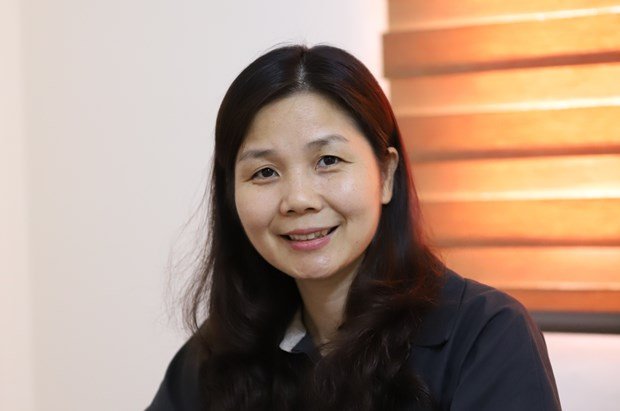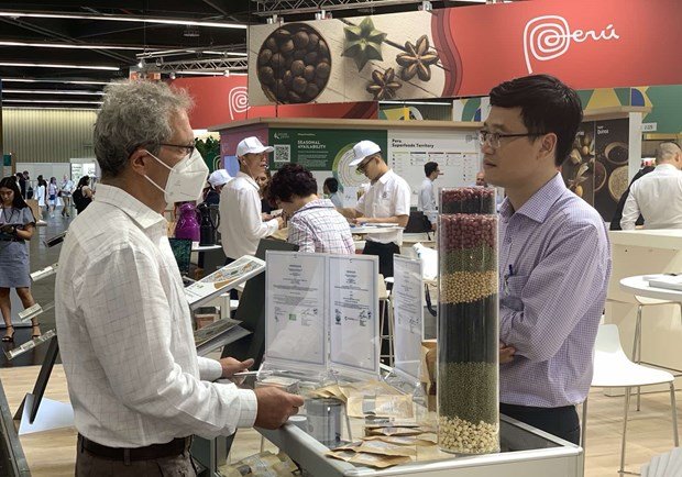 Anh Lại Ngọc Thanh, Giám đốc điều hành Công ty cổ phần thế giới Hạt Dưỡng (bên phải) giới thiệu sản phẩm của HANUTI ở khu gian hàng Organic of Vietnam, Hội chợ Biofach 2022, diễn ra từ ngày 26 – 29/7/2022 tại Nuremberg, bang Bavaria, CHLB Đức.